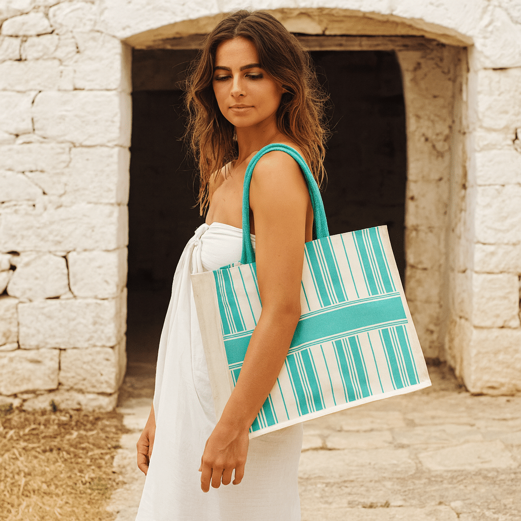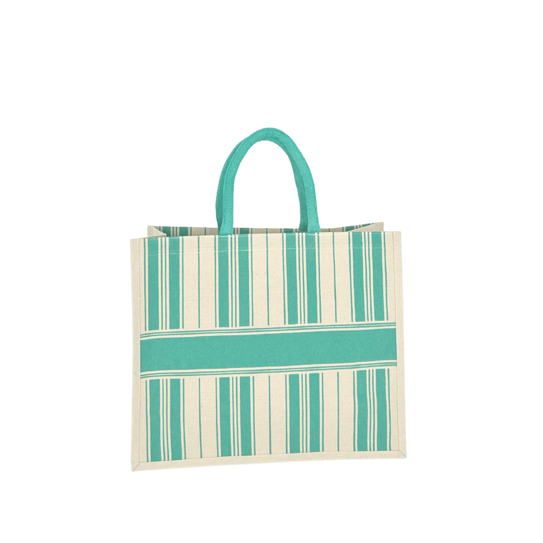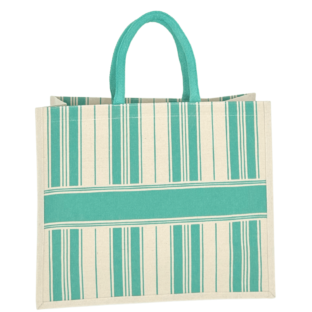 Borsa shopper realizzata in cotone laminato resistente, ideale per un utilizzo quotidiano e perfetta come articolo promozionale di alta qualità. Il design a righe verticali turchesi con fascia centrale coordinata conferisce uno stile elegante e naturale, adatto a hotel, strutture ricettive, boutique e attività che desiderano offrire un gadget premium.