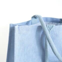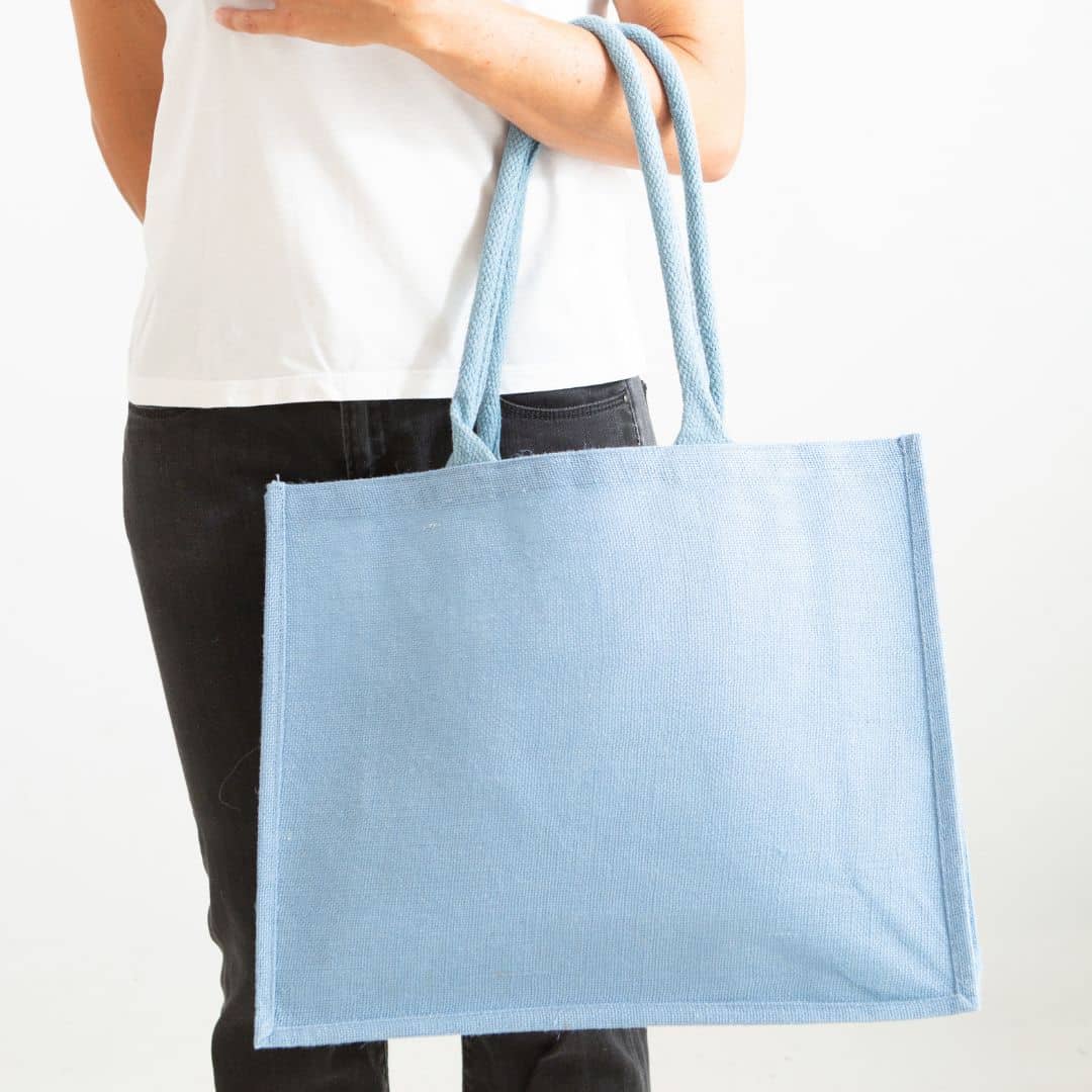 Borsa in juta cerata azzurra con comodi manici a spalla, progettata per garantire resistenza, praticità e comfort. Disponibile in una vivace gamma di colori, è ideale per un utilizzo quotidiano o promozionale.