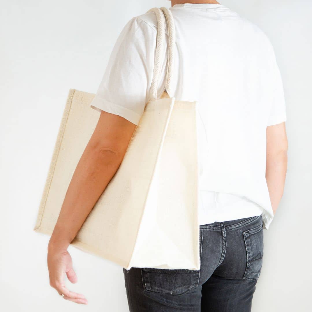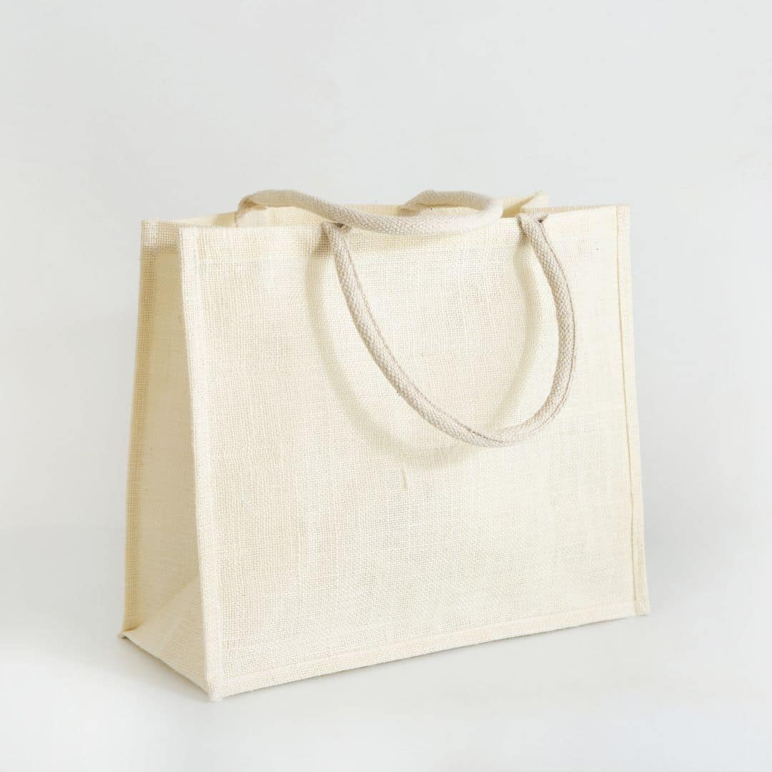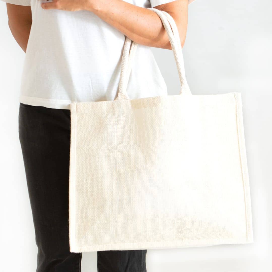 Borsa in juta bianca tinta, elegante e resistente, progettata per unire estetica naturale e funzionalità. La juta cerata internamente garantisce maggiore durata e protezione, mentre i manici imbottiti in cotone offrono un comfort ottimale anche durante il trasporto di carichi più pesanti.