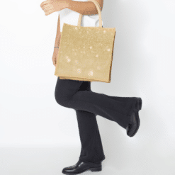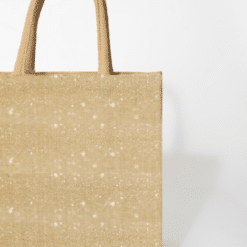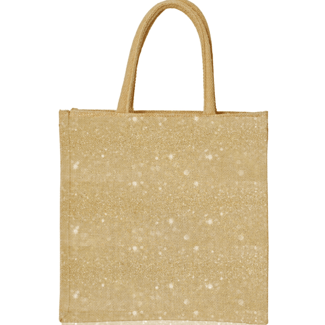 Borsa in juta laminata che unisce stile e praticità, offrendo una soluzione ecologica e raffinata per packaging e regali aziendali. Il filo metalizzato color oro integrato nella tessitura dona un elegante effetto luminoso, conferendo alla borsa un aspetto premium ed esclusivo.