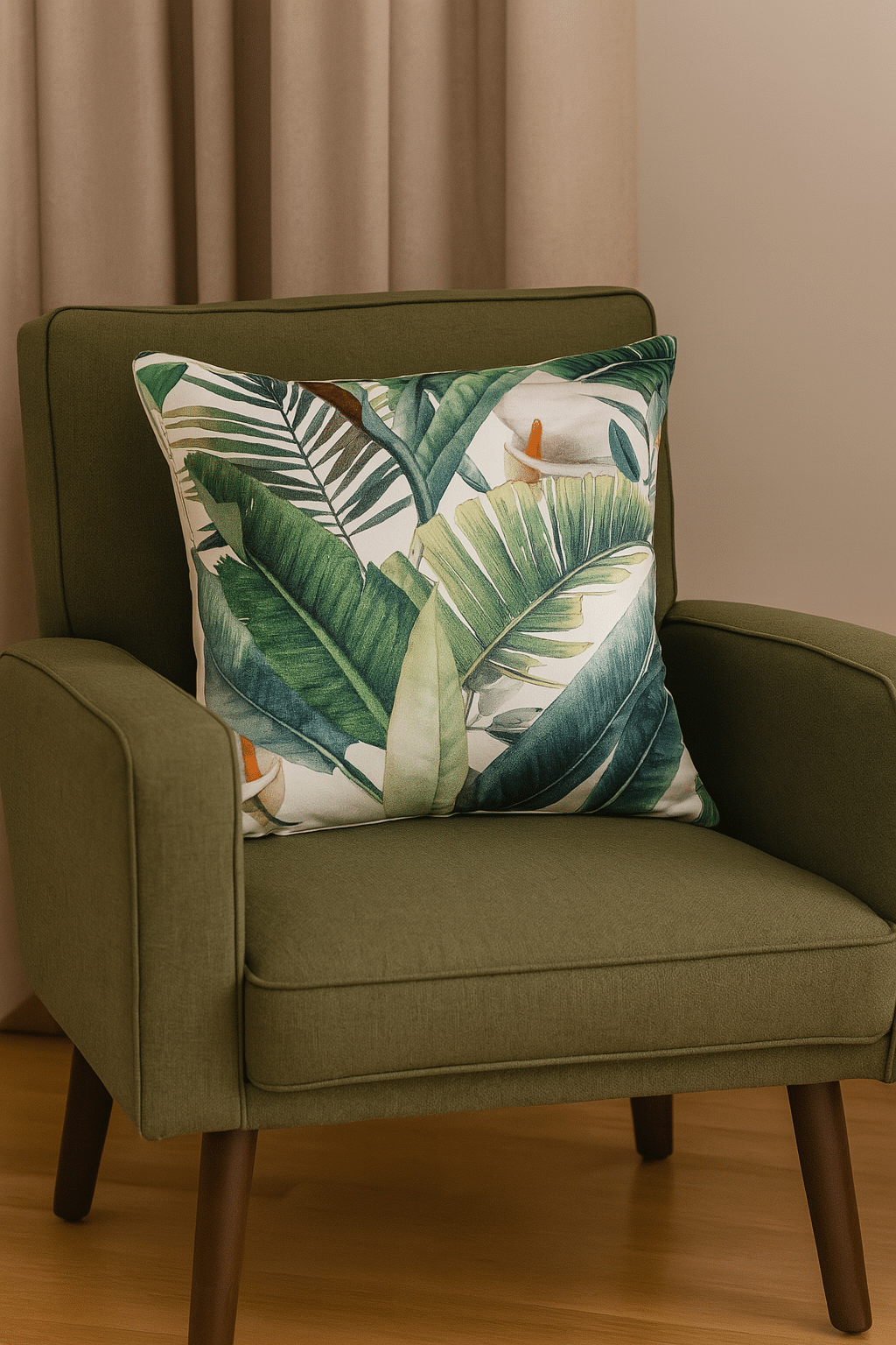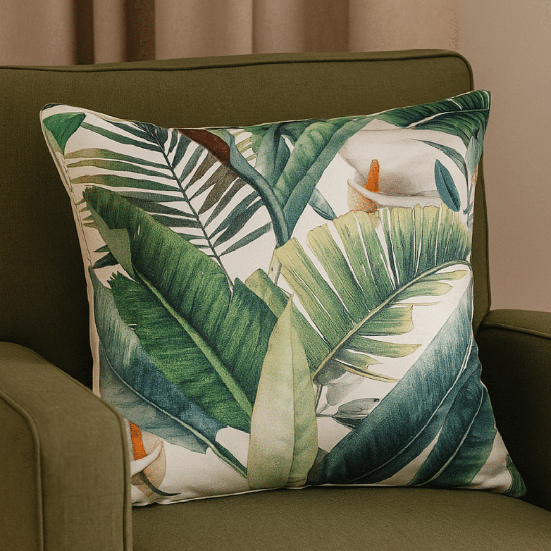 The digital print featuring calla lilies and leaves adds a refined, natural touch, perfect for styling sofas, beds, or decorative corners with a harmonious and sophisticated look.