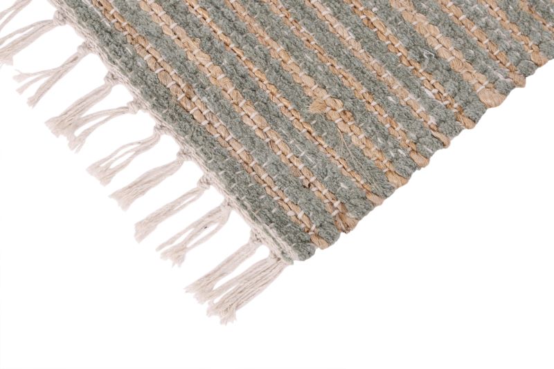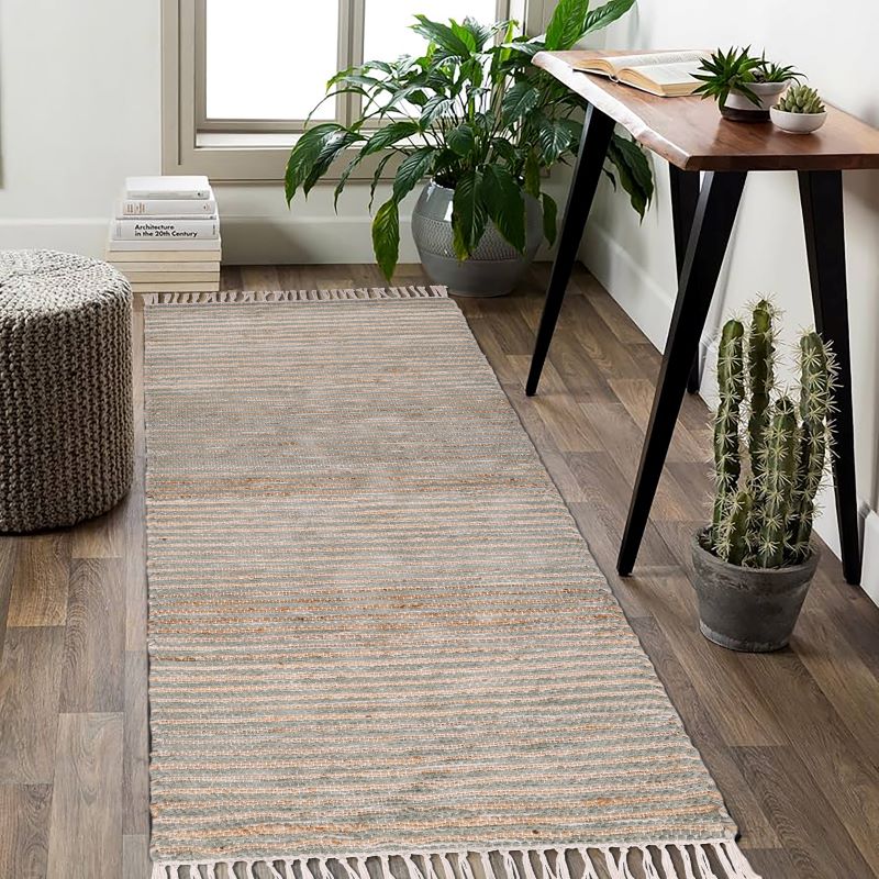 The sturdy jute fibers provide a textured, organic look, while the cotton blend adds softness and comfort underfoot. Decorative fringes at the ends complete the design with a simple yet sophisticated handcrafted detail.