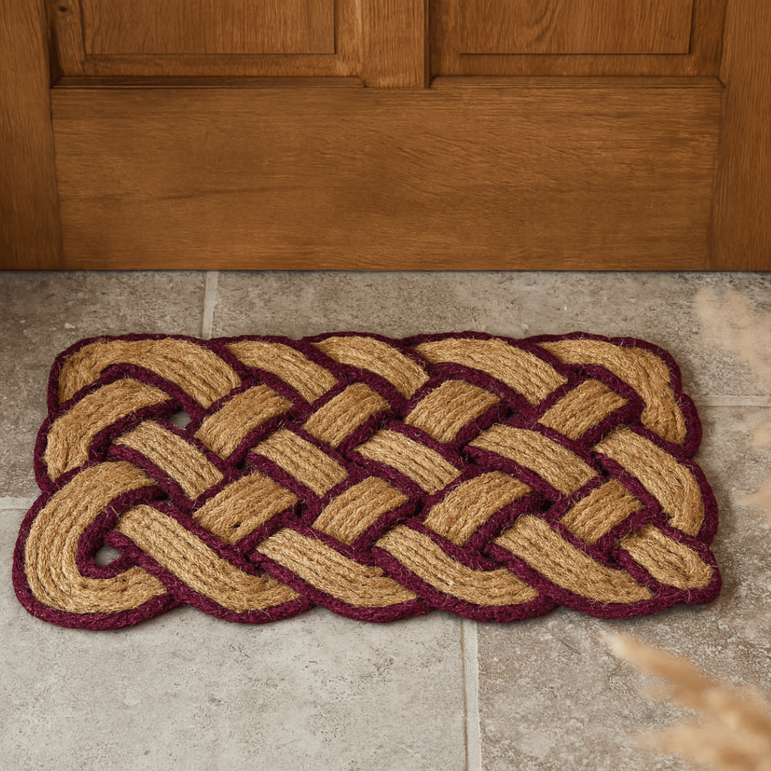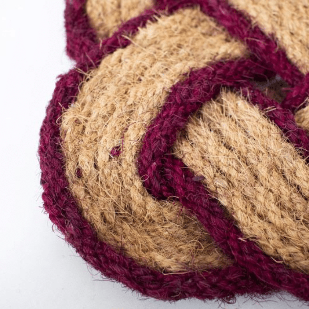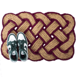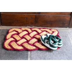 Tappeto in corda di cocco intrecciata alla marinara, realizzato a mano con cura e maestria artigianale. Questo tappeto combina robustezza, naturalità e stile, grazie all’utilizzo di fibra di cocco naturale con inserti rossi che donano un tocco di colore e personalità.